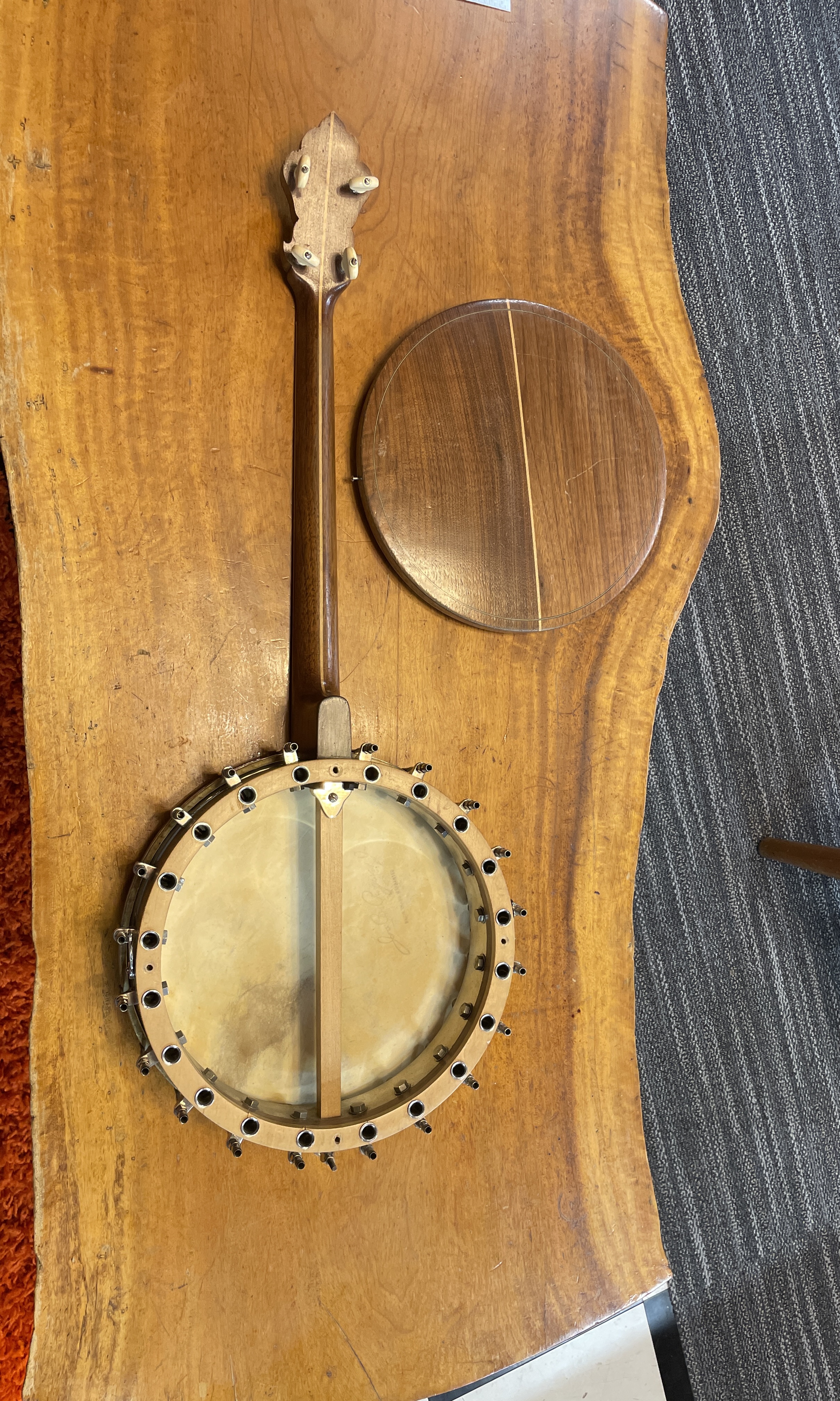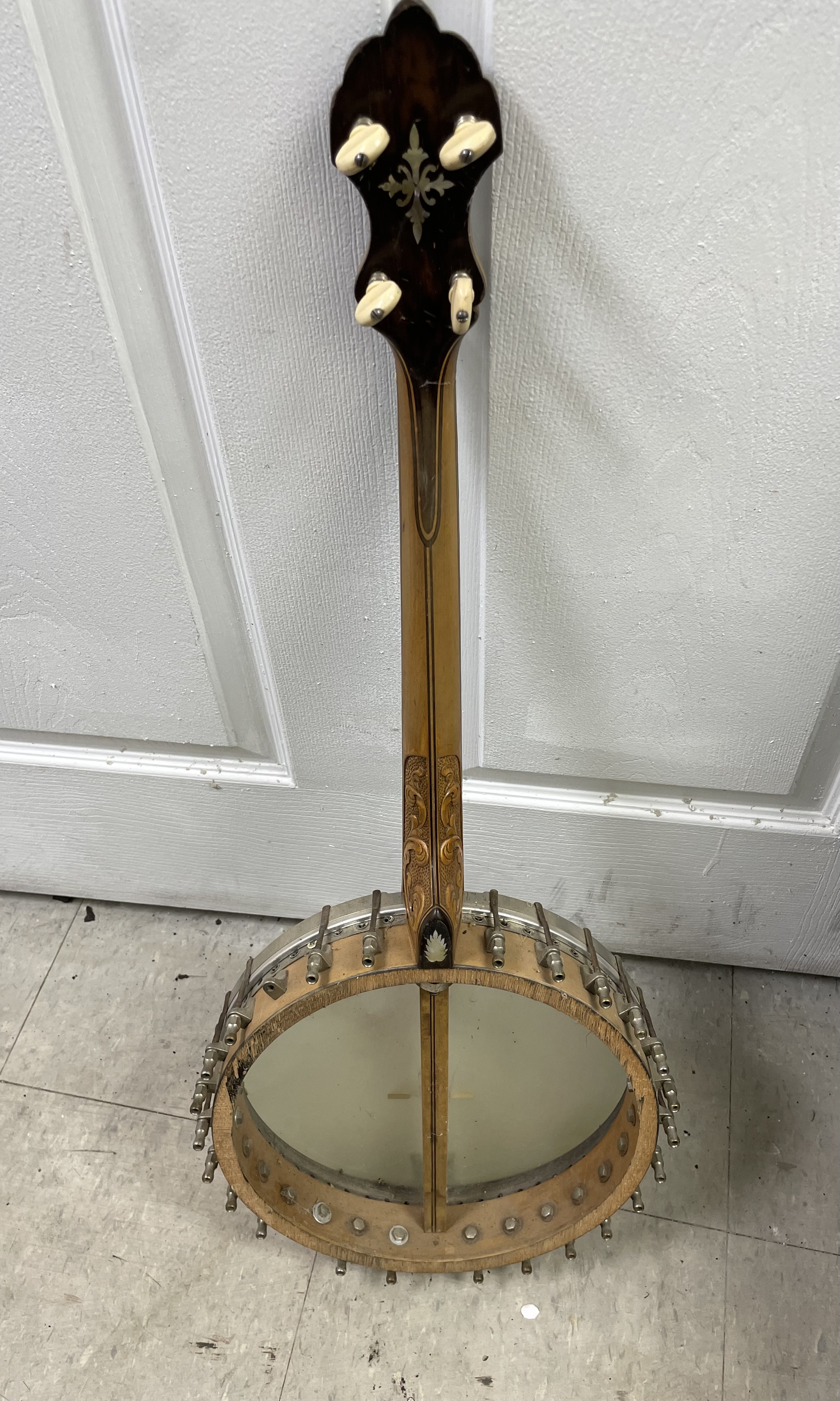 There seems to be a lot Orpheum tenors in here. We have a lot of extra necks that could be good for folks needing to replace original inlays on their instruments. The Bacon Style B plectrum is an amazing banjo, presently tuned to Chicago tuning. It would be great for a guitar player looking to get a banjo tone. It’s all original, with possible exception of tailpiece. There is a Bacon Blue Ribbon tenor that caught my eye…I will be carefully searching for the original pop-off resonator and hardware. The inlay and neck carving on this is amazing, and this will be a priority to restore if I can find the missing parts.