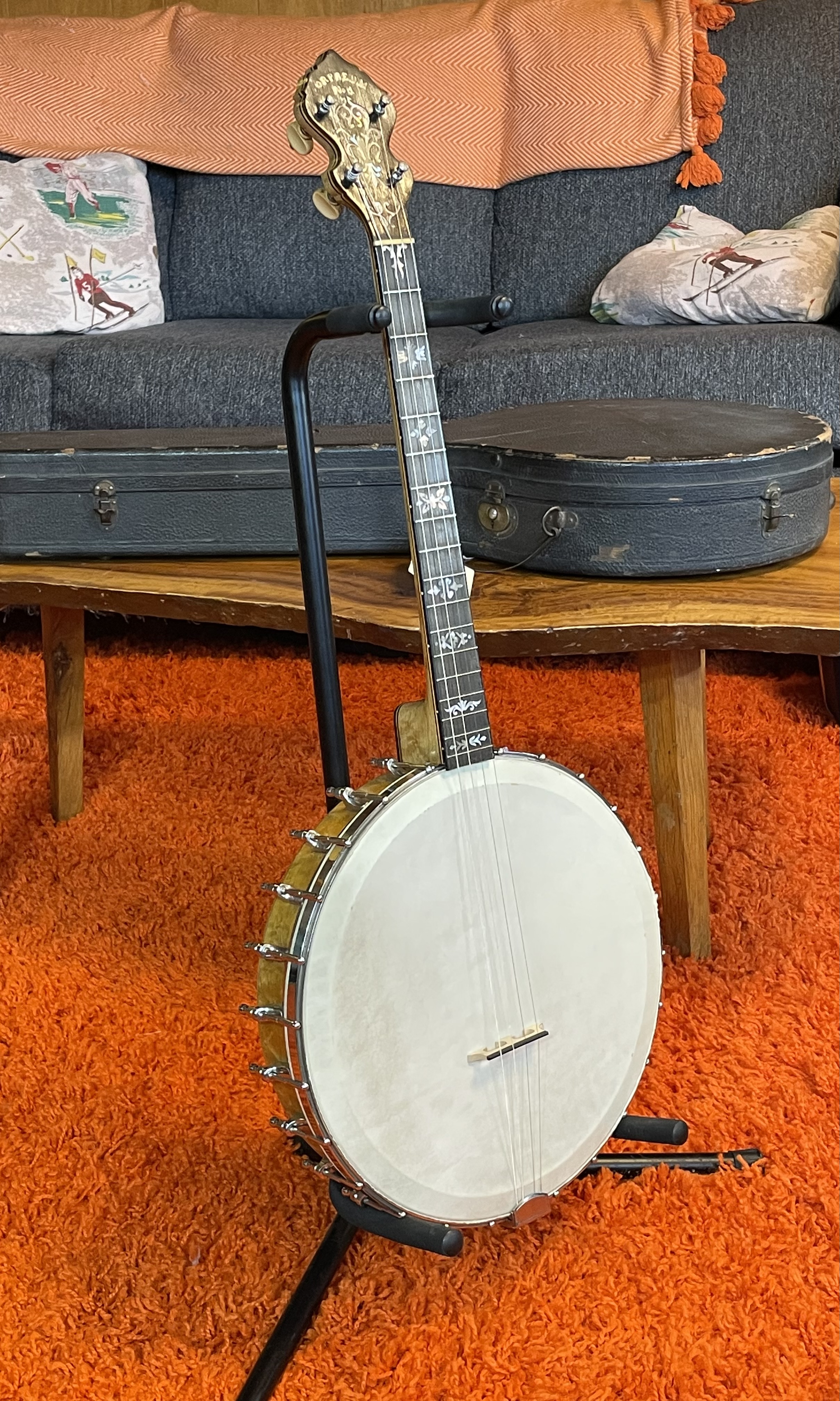 In this picture (above) are a few of the pieces we’ve found. Bacon Style B plectrum, ca. 1920s..Mint; Orpheum No 3 tenor, ca. 1920; Orpheum No 1 tenor with huge 12 1/8″ rim (warped neck…great candidate for conversion to 5-string); Orpheum No 1 11″ tenor, needs new head etc…; S.S. Stewart Wondertone 19 fret tenor; ca. 1949 Harmony lap steel (ok, there is more than just banjo stuff).